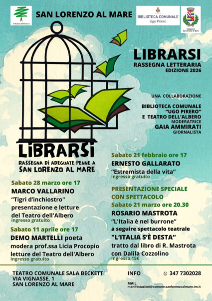 Sabato 11 aprile alle ore 17:00 nell’ambito della Rassegna Letteraria Librarsi, si terrą presso il Teatro Comunale Sala Beckett in via Vignasse 1 a San Lorenzo al Mare (Imperia) la presentazione del libro di Demo Martelli «Finestra con vista – poesia» Letture a cura del Teatro Dell’albero. Ingresso gratuito. ‘